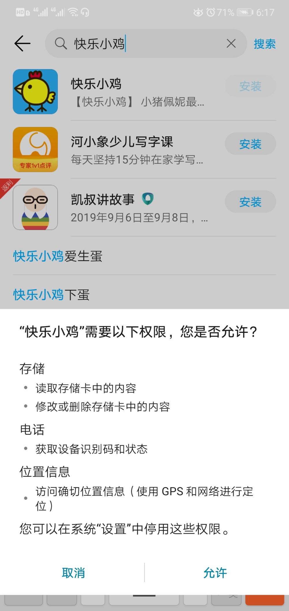 记者登录“快乐小鸡”,在该APP中未发现与地理位置相关的功能。实际上,有多款儿童APP均索取了地理位置权限,如时尚小公主、奇妙的怪物朋友等,但这些APP均提供了拒绝选项,并非强制安装。