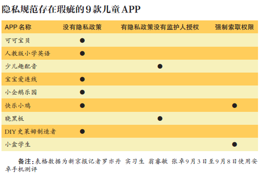 依据以上原则,新京报记者在9月3日至9月8日期间测试了30款针对儿童使用的APP,发现其中有9款在儿童信息保护方面存在瑕疵,包括没有隐私协议、没有儿童监护人同意选项等。