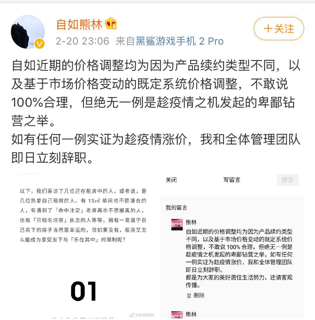 10天后的昨晚,熊林再度通过微博解释:自如近期的价格调整均为因为产品续约类型不同,以及基于市场价格变动的既定系统价格调整,不敢说100%合理,但绝无一例是趁疫情之机发起的卑鄙钻营之举。“如有任何一例实证为趁疫情涨价,我和全体管理团队即日立刻辞职。”