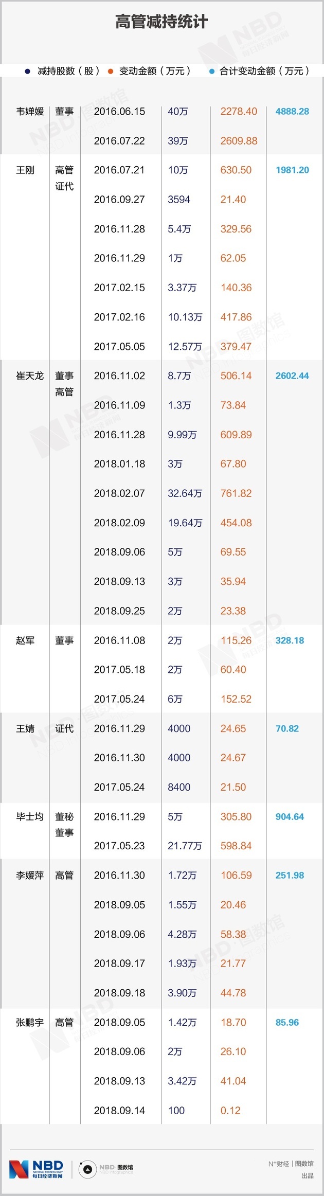 而她在任职期间,2016年减持公司股票共79万股,套现约5000万元。离职后,韦婵媛在2017年再次减持218.74万股,但其仍为公司第十大股东,直至2018年一季度从前十大股东名单里消失。