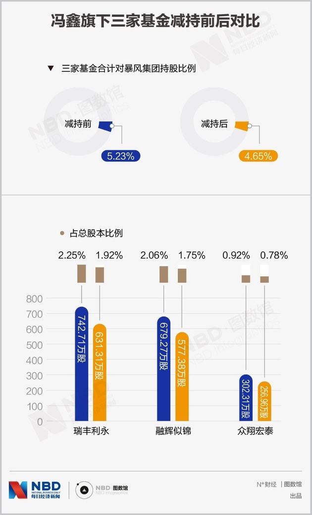 减持前,冯鑫旗下三家基金合计持有暴风集团5.23%股份。而在减持后,截至2019年1月3日,三家基金合计持有暴风集团4.65%股份。