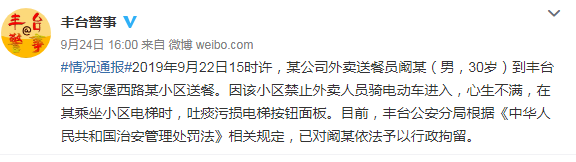 中国网科技9月25日讯 据北京丰台公安分局24日官方通报:2019年9月22日15时许,某公司外卖送餐员阚某(男,30岁)到丰台区马家堡西路某小区送餐。因该小区禁止外卖人员骑电动车进入,心生不满,在其乘坐小区电梯时,吐痰污损电梯按钮面板。目前,丰台公安分局根据《中华人民共和国治安管理处罚法》相关规定,已对阚某依法予以行政拘留。
